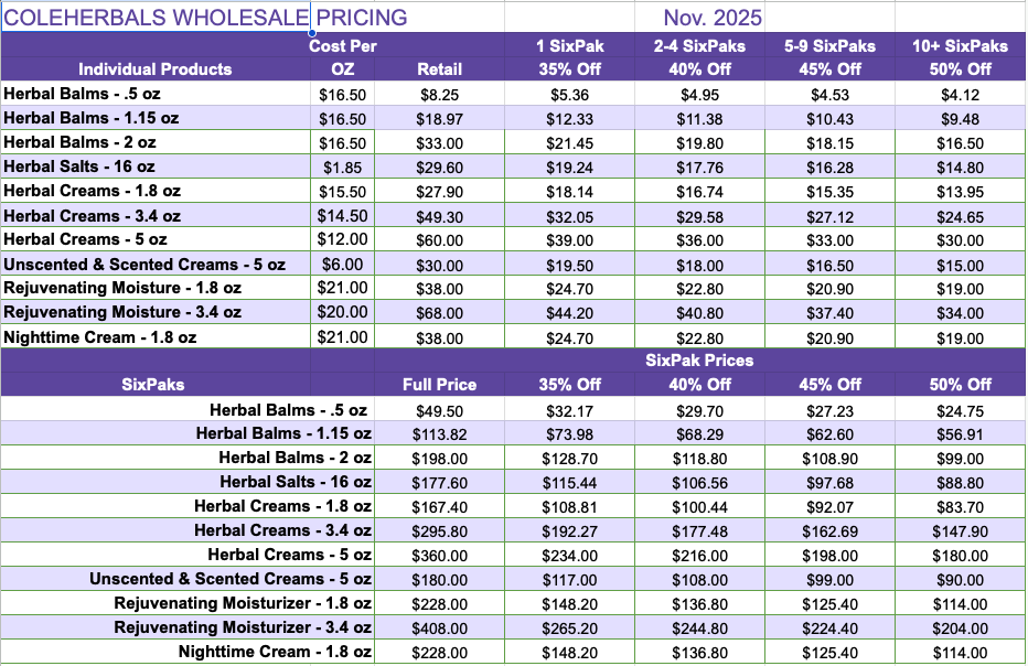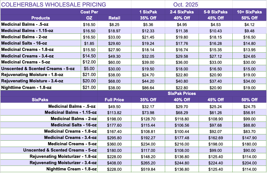Wholesale prices are discounted from the retail prices listed on our Coleherbals website, and vary based on the quantity ordered.