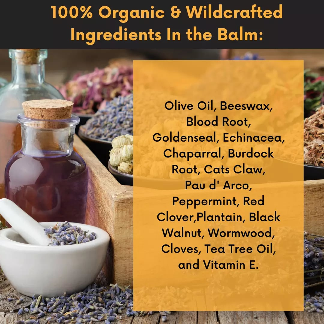 100% Organic and Wildcrafted Ingredients: Olive Oil, Beeswax, Horehound, Ginger Root, Wild Cherry, Vervain, Elecampane Root, Echinacea, Chaparral, Chickweed, Colts Foot, Feverfew, Pleurisy Root, White Willow, Marshmallow Root, Menthol Crystals, Vitamin E and a blend of Essential Oils.