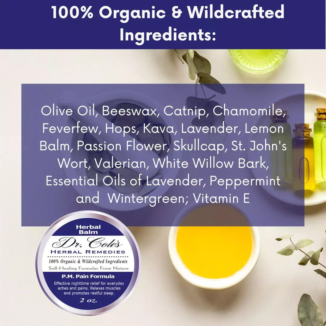 100% Organic and Wildcrafted Ingredients: Olive Oil, Beeswax, Catnip, Chamomile, Feverfew, Hops, Kava, Lavender, Lemon Balm, Passion Flower, Skullcap, St. John's Wort, Valerian, WhiteWillow Bark, Essential Oils of Lavender, Peppermint and Wintergreen; Vitamin E.