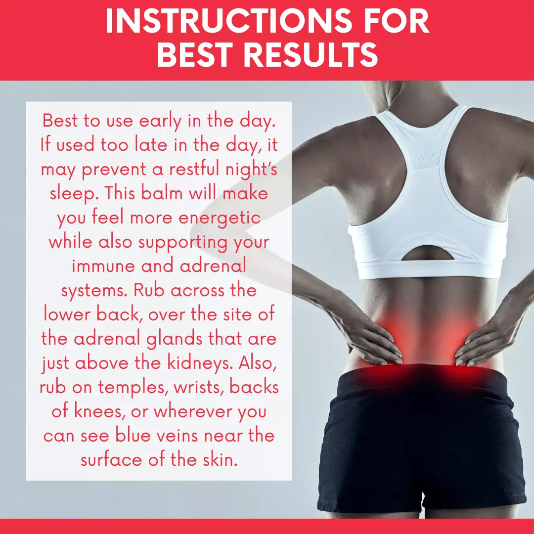 Organic and Non-Toxic Herbal Balm. Helps Prevent Adrenal Fatigue Caused By Chronic Stress. Supports the Adrenals, Boosts the Immune System, Increases Energy Levels, Energizes Without Stimulating, Helps Regulate Menstrual Cycles, and Reduces Related Edema. Safe for All Ages. Our Vitality Herbal Balm was created by a Naturopathic doctor after 20 years of successfully working with patients suffering from adrenal fatigue and chronic stress. She discovered more effective solutions for adrenal insufficiencies by using organic and wildcrafted, non-chemical products that are not harmful to the body, yet are very effective in supporting the adrenals and boosting the immune system.