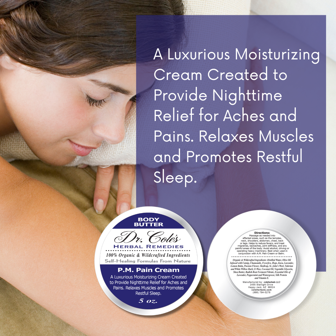 Luxurious Moisturizing Cream Formula. Organic and Non-Toxic. Created to provide Nighttime Relief for Aches and Pains. Relaxes Muscles and Promotes Restful Sleep. Safe for all ages. Created by a Naturopathic doctor after 20 years of successfully working with patients suffering from body aches and pains. She discovered more effective solutions for these aches and pains by using organic and wildcrafted, non-chemical ointments applied directly to the area in need.