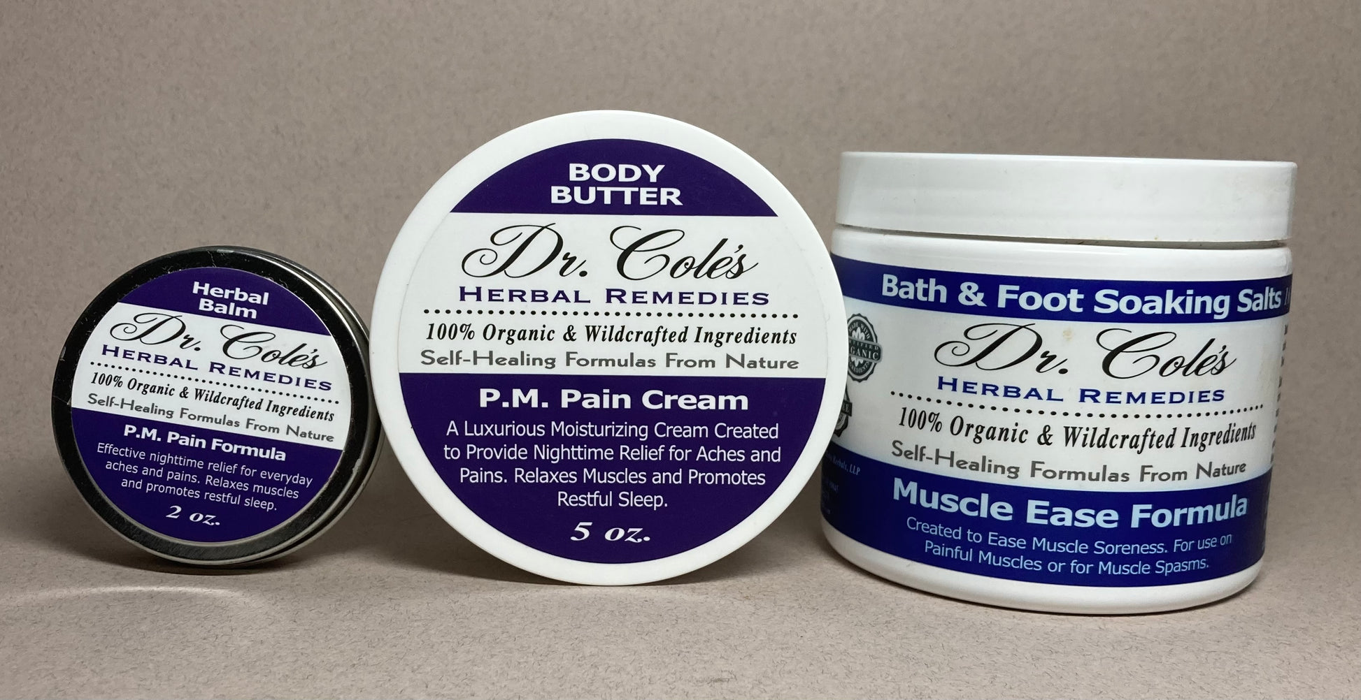 Dr. Cole's P.M. Pain Herbal Cream: Distilled Water, Olive Oil Infused with Catnip, Chamomile, Feverfew, Hops, Kava, Lavender, Lemon Balm, Passion Flower, Skullcap, St. John’s Wort, Valerian, White Willow Bark; E-Wax, Coconut Oil, Vegetable Glycerin, Shea Butter, Radish Root Ferment Filtrate, Essential Oils of Lavender, Peppermint and Wintergreen; Silk Protein and Vitamin E.
